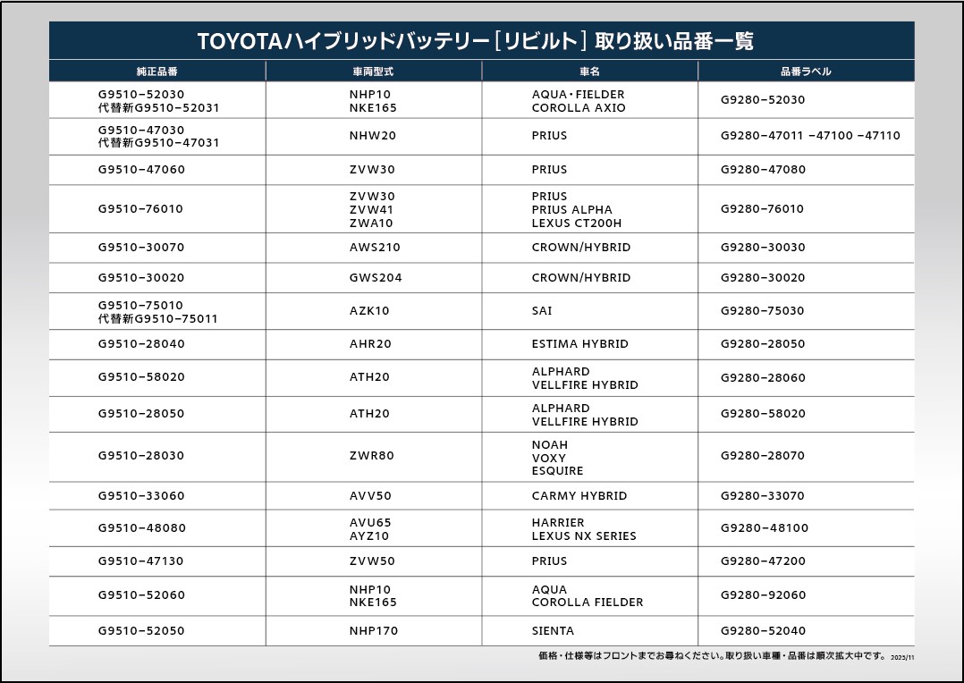 トヨタのハイブリッド車用リビルトバッテリーカタログをご希望のお客様は、お気軽にお問合せください。